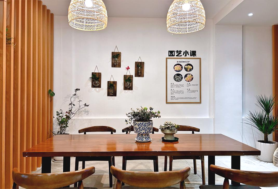 青龙社区绿色驿站位于武汉长江新区武湖街道青龙社区。驿站主要由室内空间构成,设计总面积约40m²。项目通过对社区阅览室进行改造,在保留原本休憩活动空间的前提下,利用靠墙区域设置植物花架,形成植物认养空间,同时结合园艺书籍借阅区,墙面宣传展板及多媒体投影设备进行绿色驿站相关内容宣传展示。