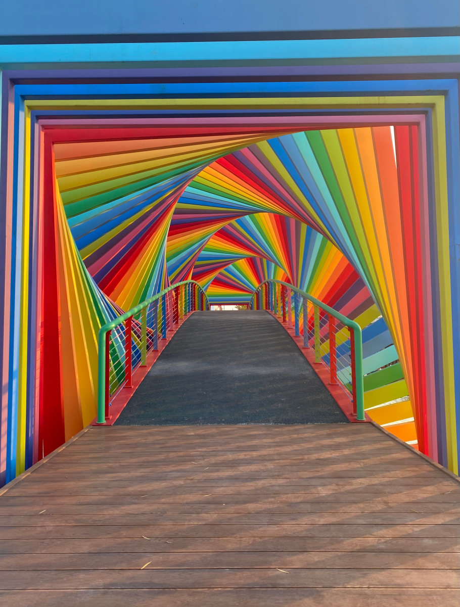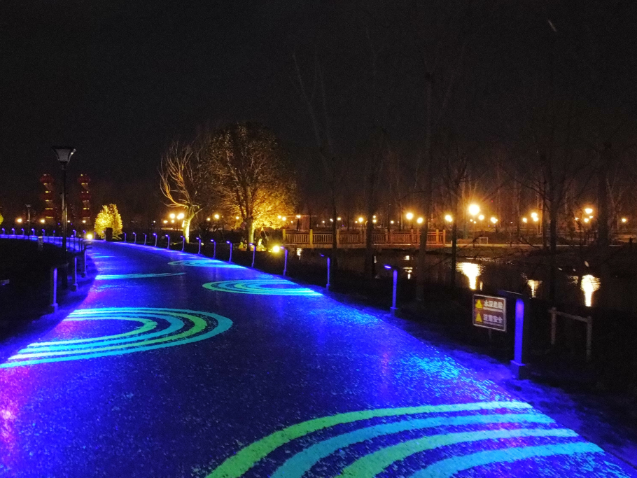 桥梁作为整个景观设计的重要组成部分,也展现出别样的魅力。桥梁的设计独具特色,以其优雅的线条和精心的灯光布置,为整个环境增添了一份浪漫与诗意。在夜晚,桥梁上的灯光温柔地洒在周围,如同星光点点,为行人照亮道路,同时也为整个景观增添了一层神秘的美感。桥梁与荧光跑道的设计相得益彰,共同营造出一个令人心驰神往的梦幻之境。